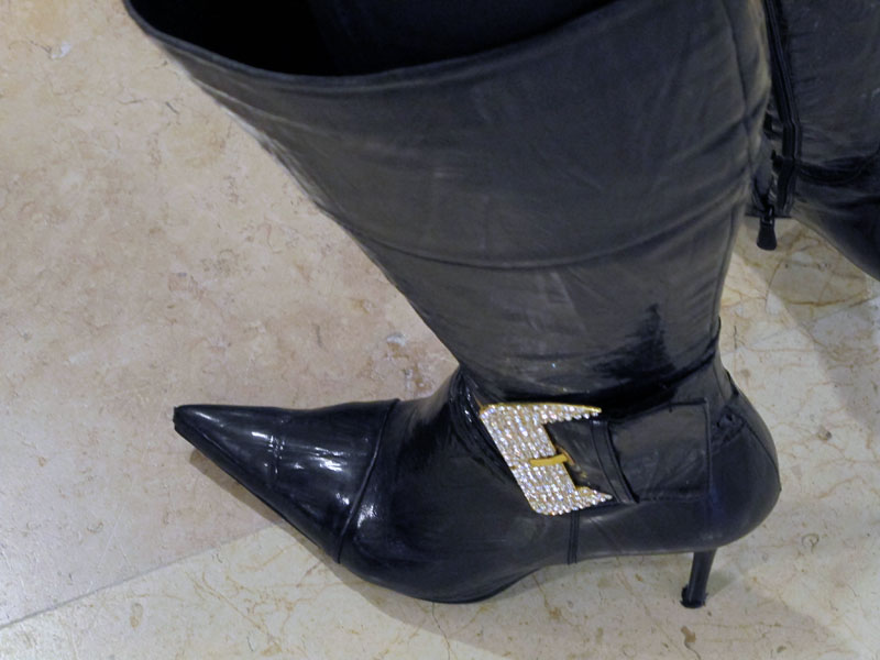 …and couldn’t resist getting a shot of this woman’s boots waiting in line to get on the plane in front of me. Definitely back in civilization. They kind of reminded me of the wicked witch of the west’s shoes when the house fell on her and the toes of her boots curled up. Hell would freeze over before I would wear these…well, maybe on Halloween.