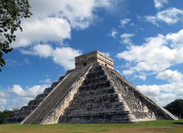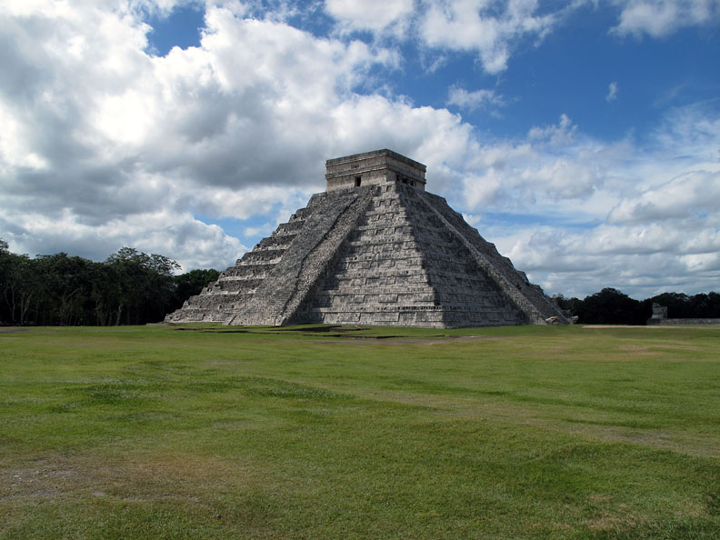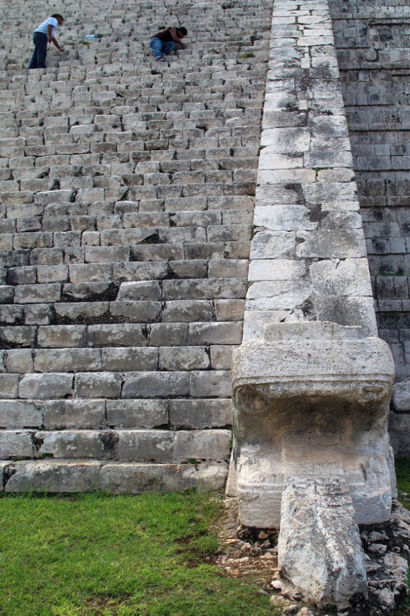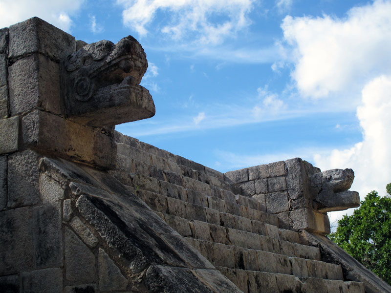 “Dominating the center of Chichén is the Temple of Kukulkan, often referred to as “El Castillo” (the castle). This step pyramid has a ground plan of square terraces with stairways up each of the four sides to the temple on top. On the Spring and Autumn equinox, at the rising and setting of the sun, the corner of the structure casts a shadow in the shape of a plumed serpent – Kukulcan, or Quetzalcoatl – along the west side of the north staircase. On these two annual occasions, the shadows from the corner tiers slither down the northern side of the pyramid with the sun’s movement to the serpent’s head at the base.
