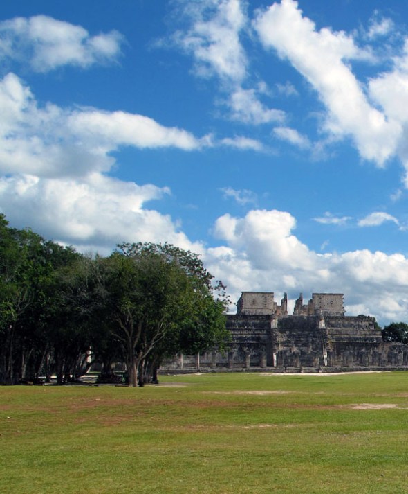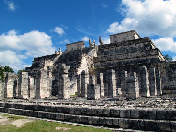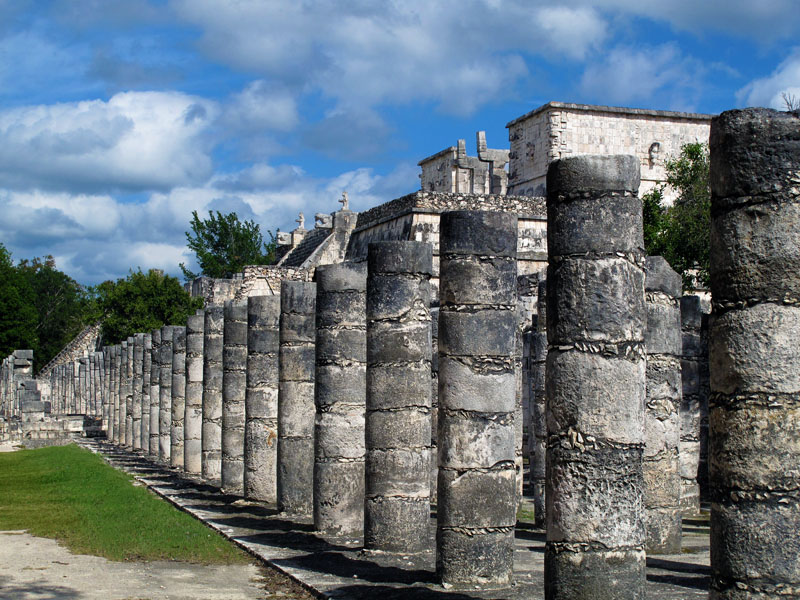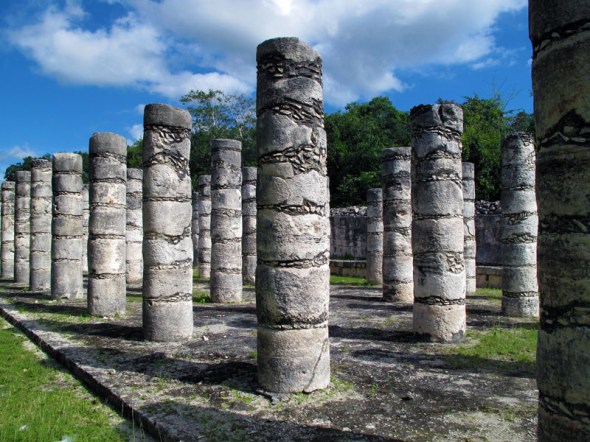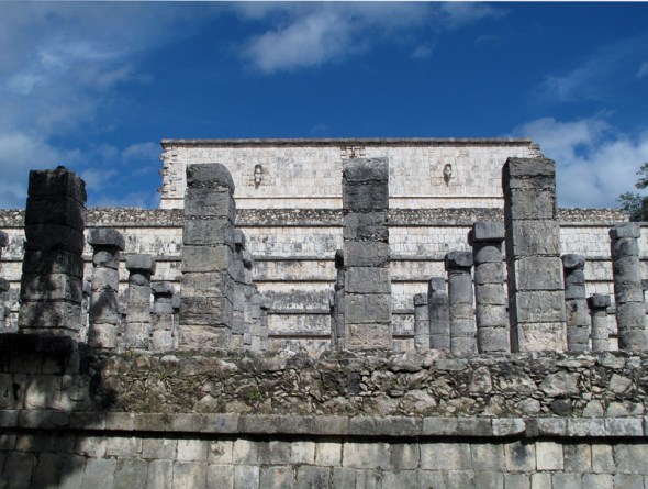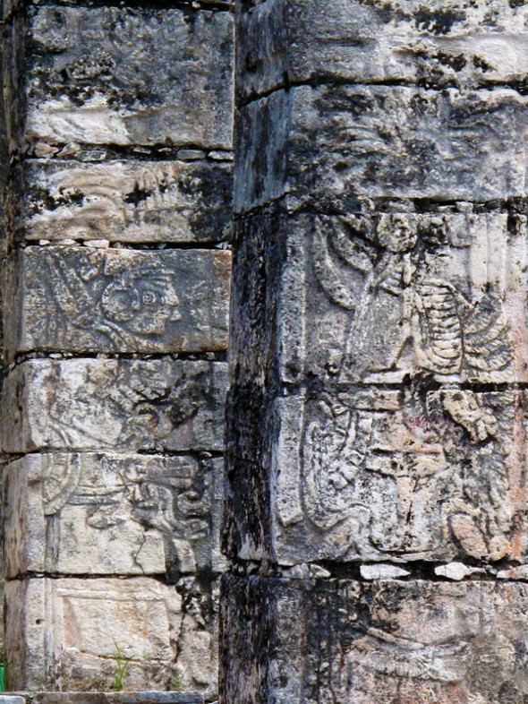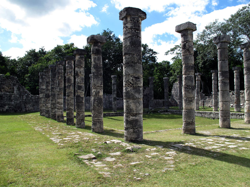 “Along the south wall of the Temple of Warriors are a series of what are today exposed columns, although when the city was inhabited these would have supported an extensive roof system. The columns are in three distinct sections: an east group, that extends the lines of the front of the Temple of Warriors; a north group, which runs along the south wall of the Temple of Warriors and contains pillars with carvings of soldiers in bas-relief; and a northeast group, which was apparently formed a small temple at the southeast corner of the Temple of Warriors, which contains a rectangular decorated with carvings of people or gods, as well as animals and serpents. The northeast column temple also covers a small marvel of engineering, a channel that funnels all the rainwater from the complex some 40 metres (130 ft) away to a rejollada, a former cenote.”