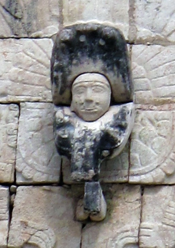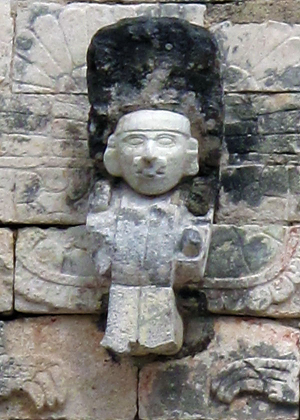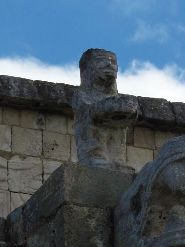 “At one end of the Great Ball Court is the North Temple, popularly called the Temple of the Bearded Man. This small masonry building has detailed bas relief carving on the inner walls, including a center figure that has carving under his chin that resembles facial hair. At the south end is another, much bigger temple, but in ruins.”