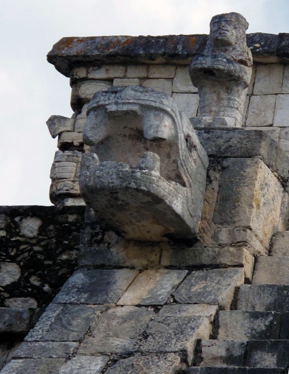 “Built into the east wall are the Temples of the Jaguar. The Upper Temple of the Jaguar overlooks the ball court and has an entrance guarded by two, large columns carved in the familiar feathered serpent motif. Inside there is a large mural, much destroyed, which depicts a battle scene.”