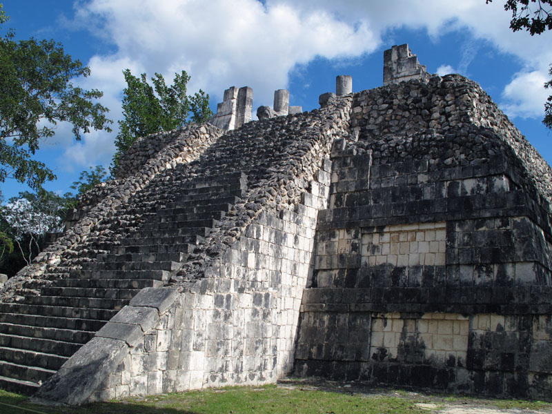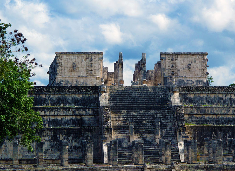 “The Temple of the Warriors complex consists of a large stepped pyramid fronted and flanked by rows of carved columns depicting warriors. This complex is analogous to Temple B at the Toltec capital of Tula, and indicates some form of cultural contact between the two regions. The one at Chichen Itza, however, was constructed on a larger scale. At the top of the stairway on the pyramid’s summit (and leading towards the entrance of the pyramid’s temple) is a Chac Mool. This temple encases or entombs a former structure called The Temple of the Chac Mool.”