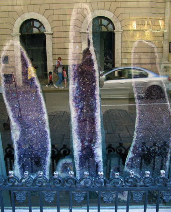 I thought this was an interesting study in reflections.  This window had a display of amethysts…but the street scene is a reflection in the window.