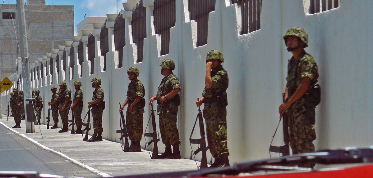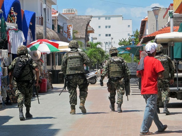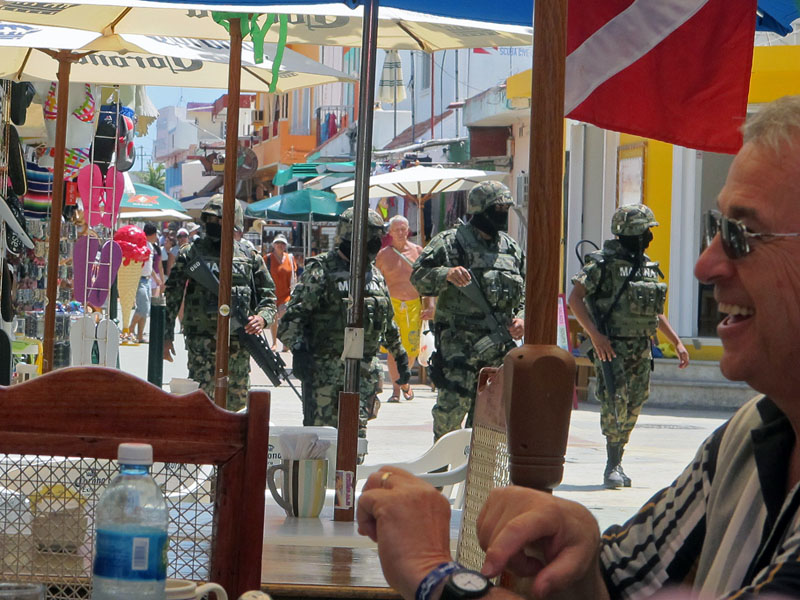 When I was there in May of 2008, the president of Mexico was scheduled for a visit on Isla, so there were many soldiers all over the island.  Even then, I didn’t see them walk down Hidalgo, although I did see Federales around town and soldiers posted here and there.