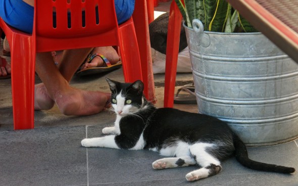 While I was sitting there, I noticed this little guy walking around who obviously belonged to one of the shop owners.  By the way, I’m not a Croc lover, but I love the coordinating camouflage look between the Crocs and the shorts here…