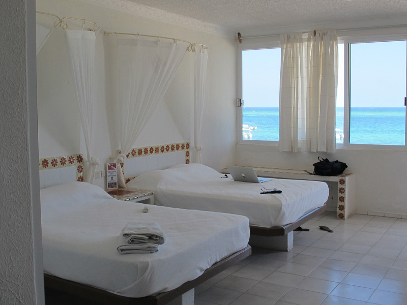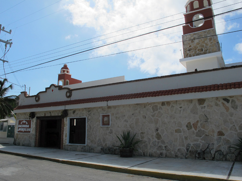 When we got to Puerto Morelos, the driver turned left when we got to the town center. I said, “Isn’t the Hacienda Morelos the other way??” He asked, “Oh, is it??” I said, “Yes, it is.” I was right…it was. Here’s the silly gringa telling the Mexican driver where her hotel is in Mexico…haha…go figure. Who knows how long we would have been driving around if I hadn’t known. Anyway, here’s the hotel…