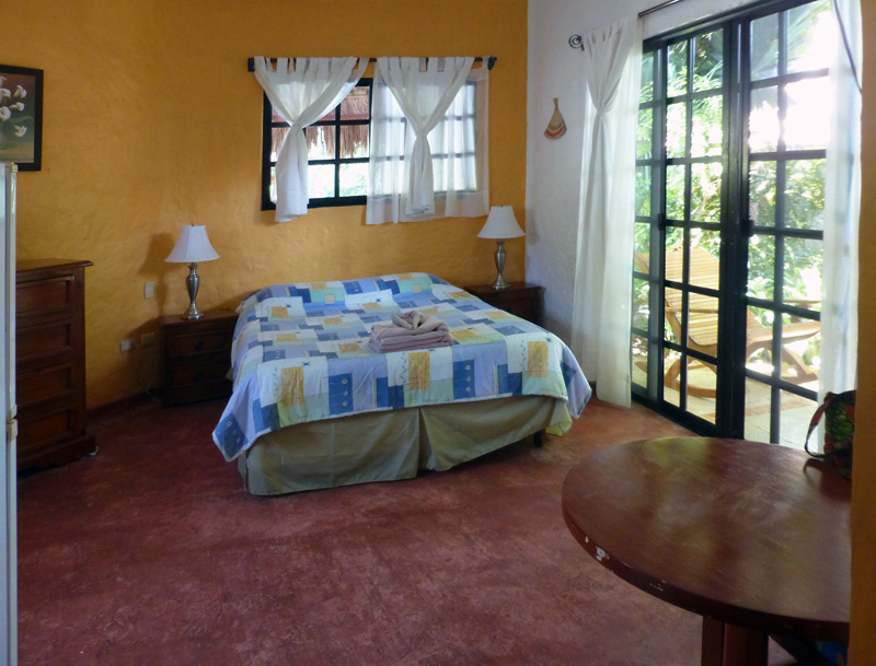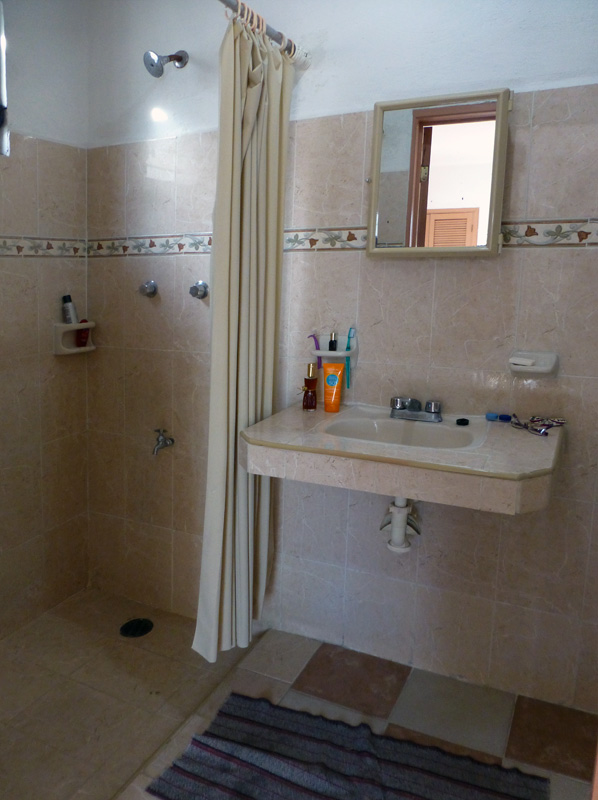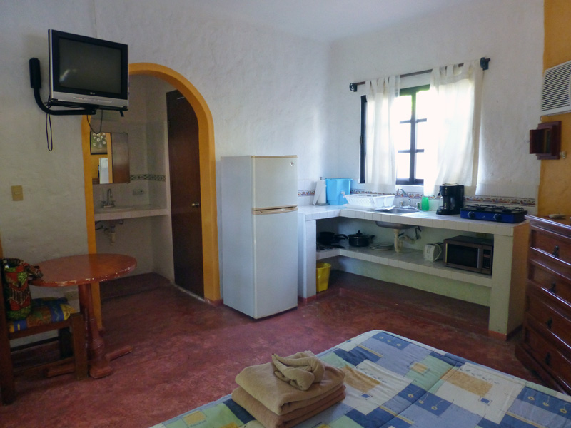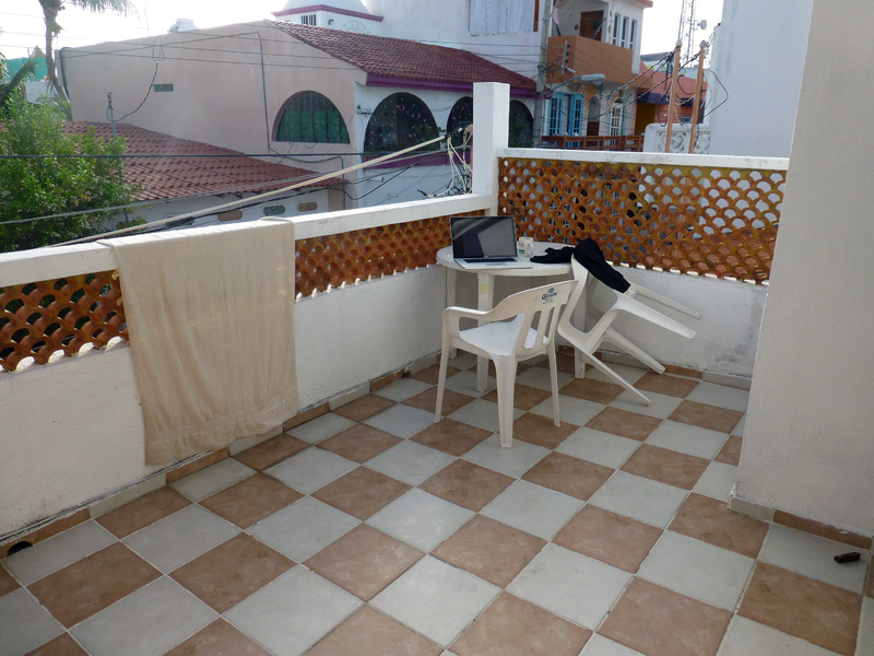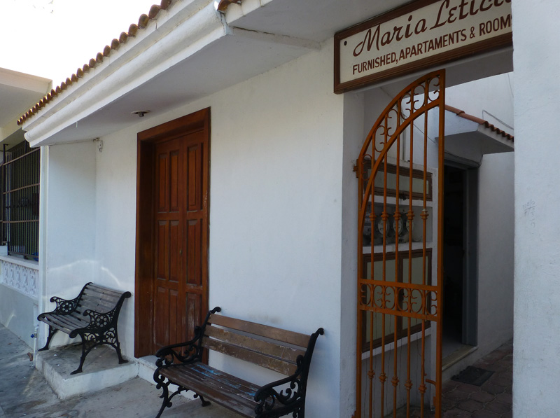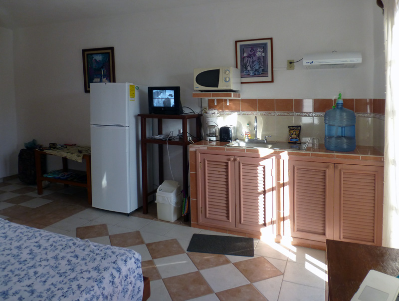 It’s my last night on the island, so I’ll share where I stayed while I was here. Maria Leticia is a little group of rooms and apartments in the downtown area of Isla. It’s owned by a local gentleman and there’s no website and you can’t make reservations through any travel service. It’s a favorite of many travelers because of its reasonable price and close proximity to the beach, restaurants and shopping. You can either call ahead to make reservations, or take a chance by just going and seeing if he has anything available. He speaks very little English, by the way. My room was $35.00 per night and here’s what you get for it. It was very comfortable, the bed was just the right hardness, and the A/C was cold (although you have to turn it off when you leave the room). So, for 14 nights, my bill was $490.00. That wouldn’t have even covered two nights at the Villa Rolandi!