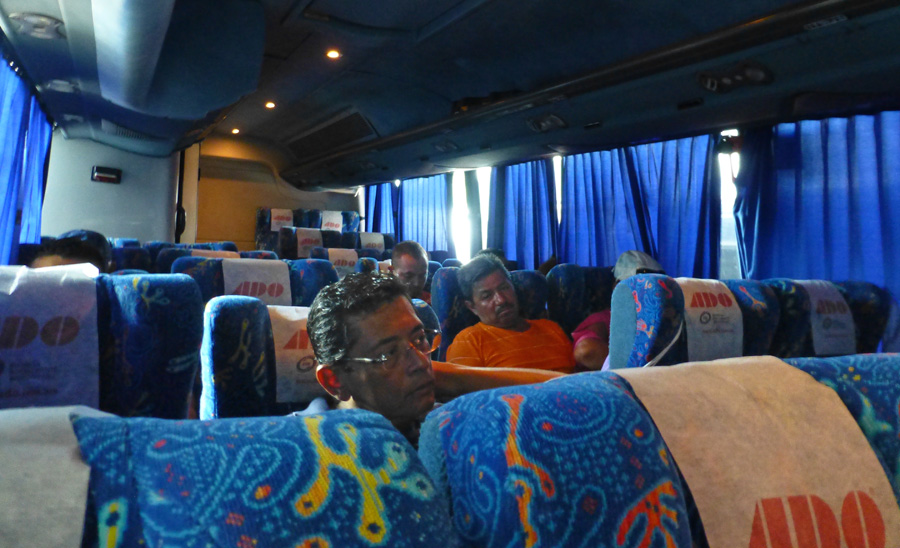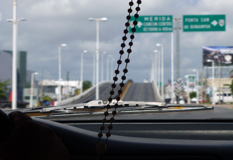 Now I have to catch a cab to the Cancun bus station. You kind of take your life in your hands with Mexican taxi drivers. I’ve learned just to sit back and watch the scenery. Sorry about the out-of-focus shot, but my camera wanted to focus on the driver’s cross hanging on the rear-view mirror instead of the street. Hmmm…maybe there was a reason for that.