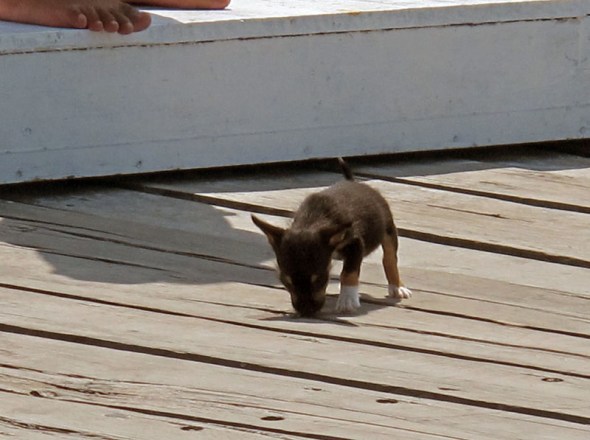 This little guy belonged to a some people who had a boat on this dock. His owner would walk down the pier and this sweetie would hurry behind him trying to keep up. But his feet were so small, he keep tripping on the spaces between the boards. You can get an idea of his size by comparing him with the foot in the upper left-hand part of the photo. It was definitely one of those “Awwwww” moments.