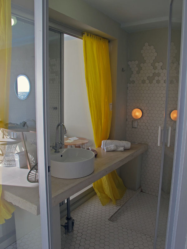 Looking the other way. There’s a safe and a fridge in that cabinet on the right. This room had one of those see-through bathrooms.