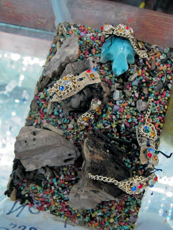 This was definitely something different for me. I was in a jewelry shop and noticed this little glass container. I thought it just contained jewelry, but when I looked inside, I could see that the “jewelry” was moving around. Upon closer look, I saw that they were beetles in which jewels and chains had been glued onto their backs. (You can see one of their splindly disgusting little black legs on the right hand side of the photo in the middle.) What an original thought, right?? I honestly couldn’t believe what I was seeing, so the guy behind the counter takes one out and sets it on his shirt and the thing just hangs there not moving. You can imagine what I said when he asked me if I wanted to try it out. (I’m sure that if someone did this in the U.S., the ASPCA would be on them in a heartbeat.) Anyway, when I showed this picture to a friend, she said, “I wonder what event you would wear beetle jewelry to?” Silly girl! I responded, “To a party given by Beetlejuice, of course!” Okay…a lame attempt at humor…my apologies.